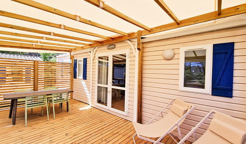 – überdachte, erhöhte Holzterrasse. 2 Liegestühle