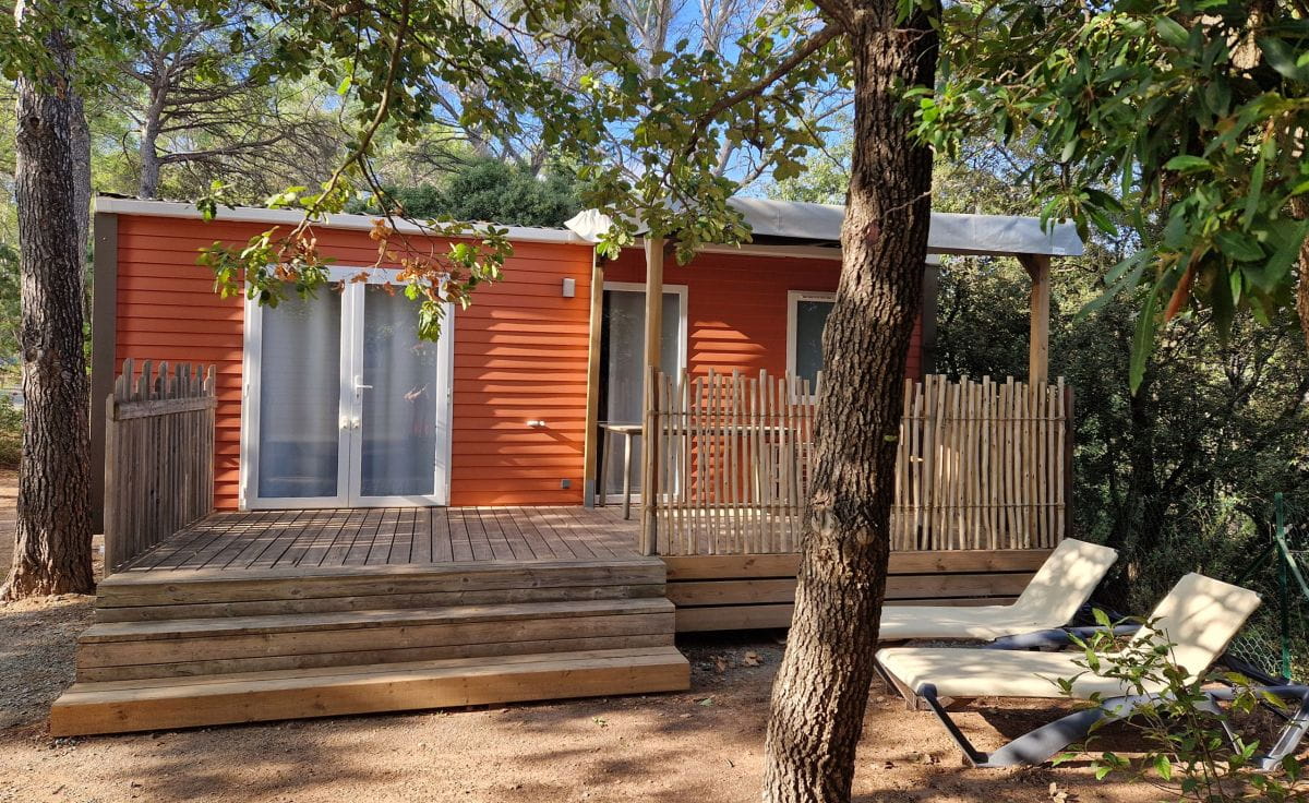 – Halbüberdachte Holzpodestterrasse mit Tisch, Stühlen und 2 Liegestühlen